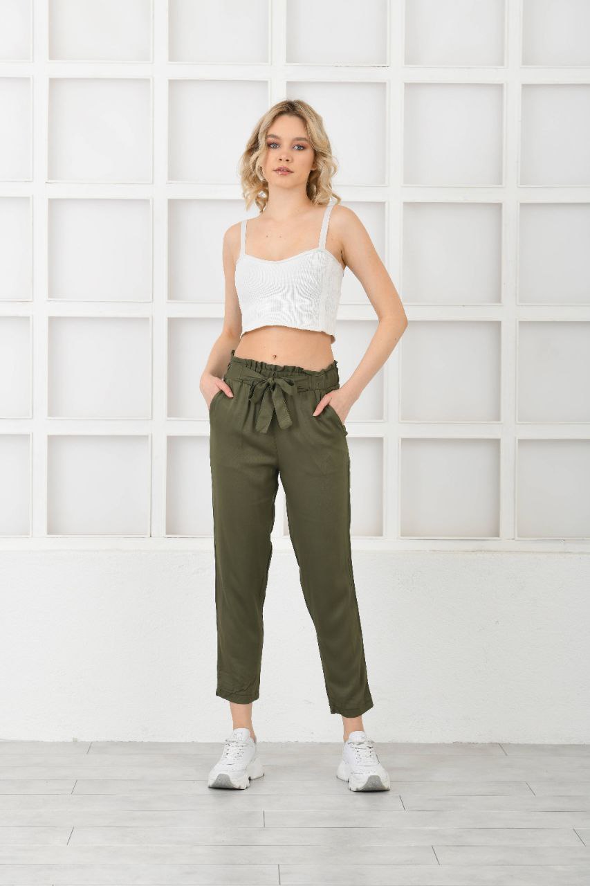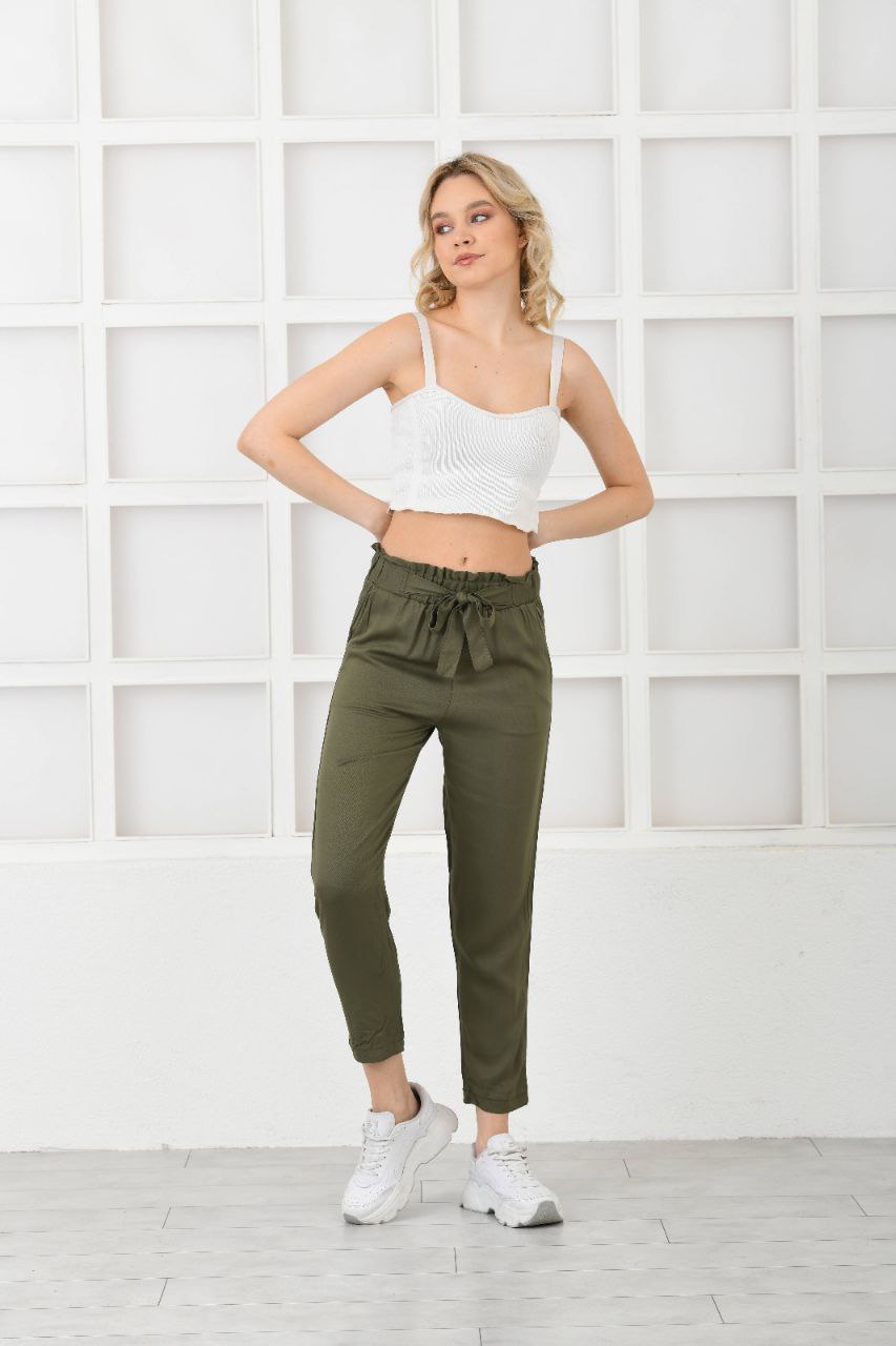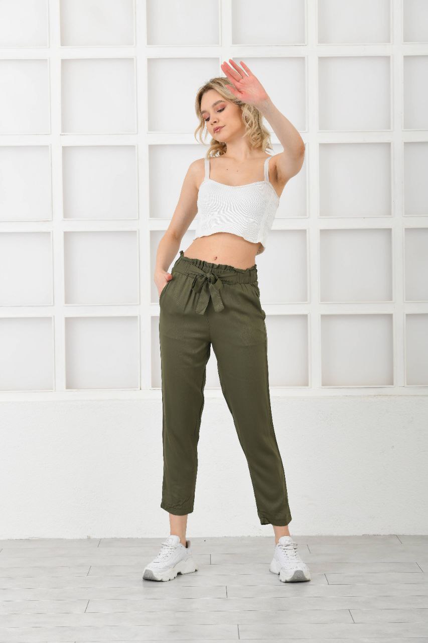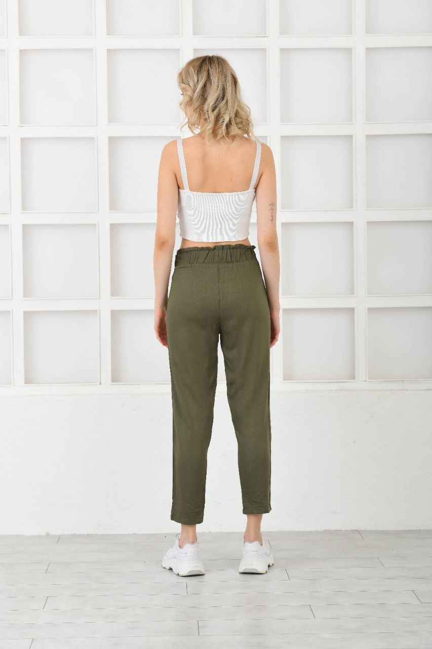 Kadın Belmando Keten Kumaş Beli Lastikli Havuç Kesim Yazlık Haki Pantolon